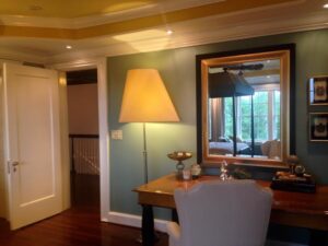 2. Color sets off this trayed ceiling’s millwork. Sherman Williams ‘Calico’ is on the walls and ‘Sunbeam’ is on the ceiling. Note the third color, the ‘Gambol Gold’ accent stripe. This is just one element we loved about this ‘Hollywood Regency’ style master bedroom designed by Kevin Vaughn. This is one of many rooms with a view.