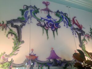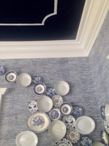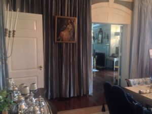 7. Silver ceiling-to-floor top-pleated curtains make this rather large dining room with many entry-ways quite intimate. The word ‘elegant’ comes to mind. Designer Laurel Powell layers the flowing wall treatment with vintage portraits and architectural panels that contrast nicely with the rooms impressive architectural elements. She brought in Becky Glover with Fischer Evans to help set the entire room like an inviting formal table, with a stunning display in the scallop shell niche.