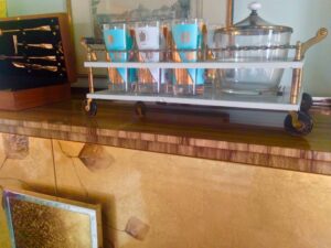 8. The curly maple embellished bar cabinet in the living room is simply exquisite, including the vintage bar accessories. A wonderful pick by designer Michelle Workman. Keep in mind that many of the items you see throughout the house are available for purchase.