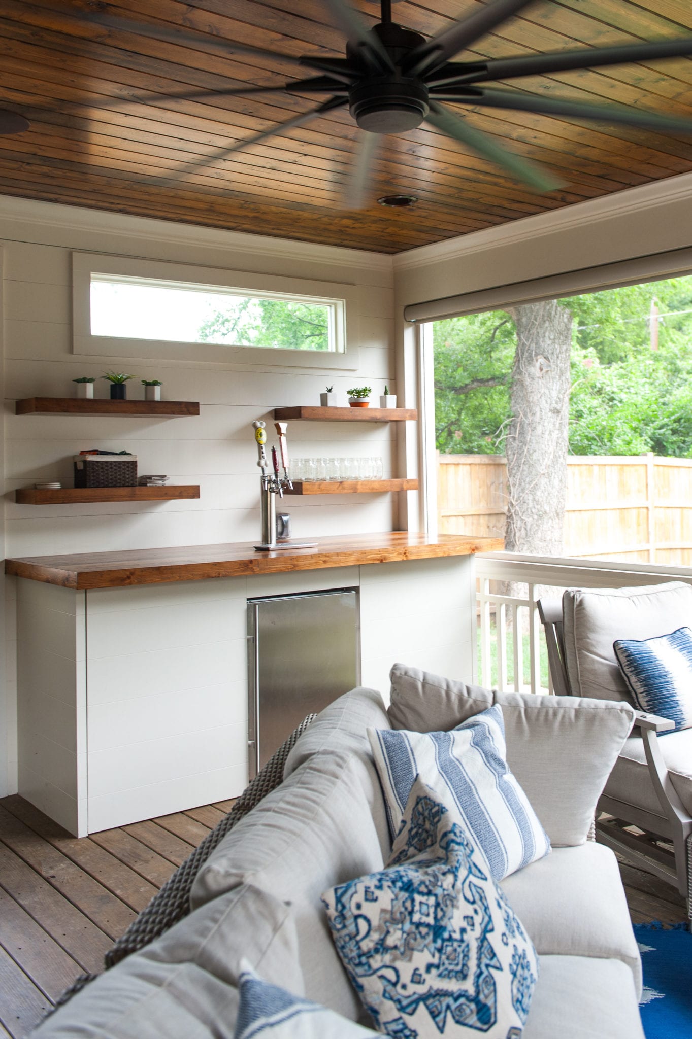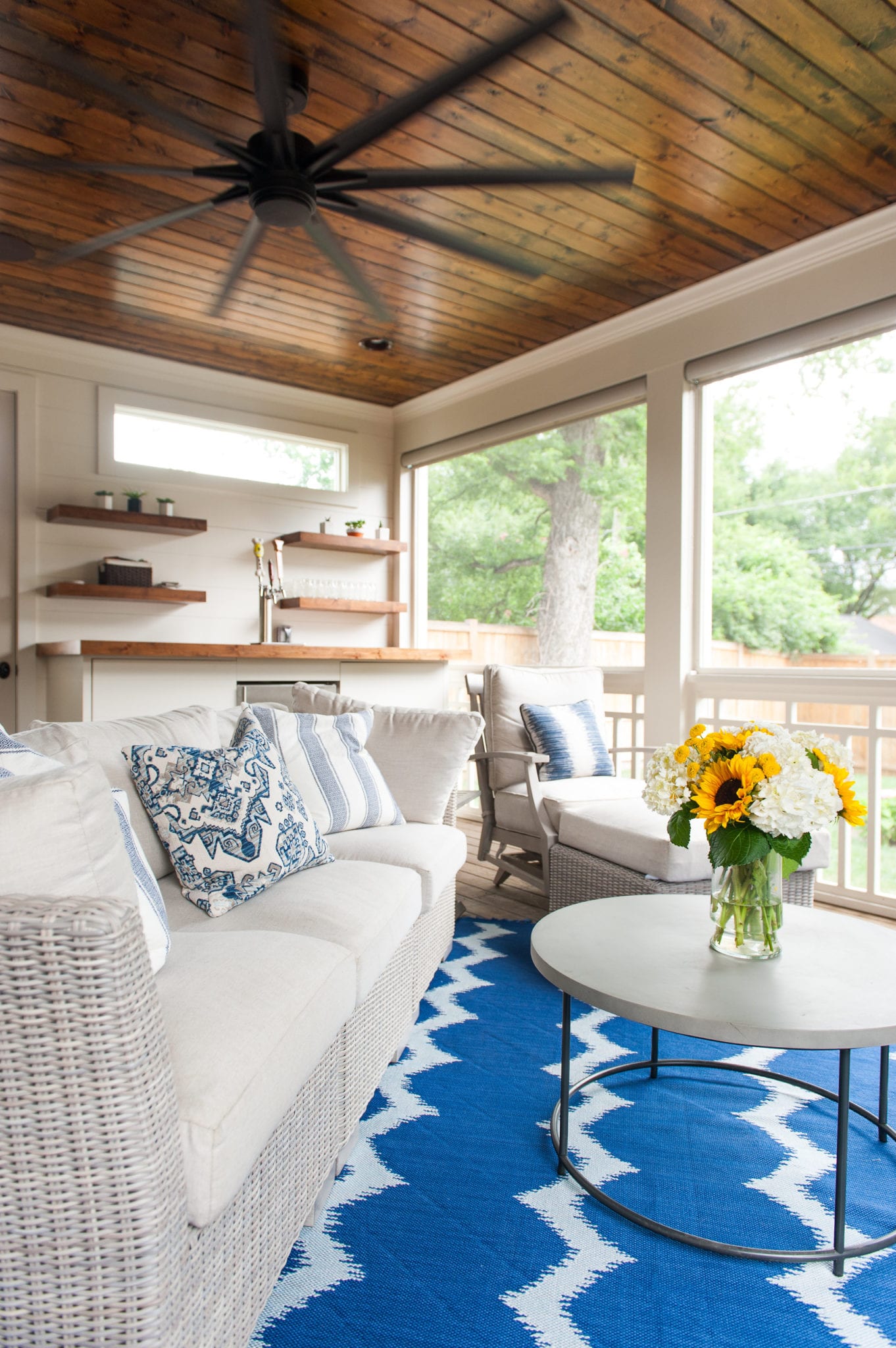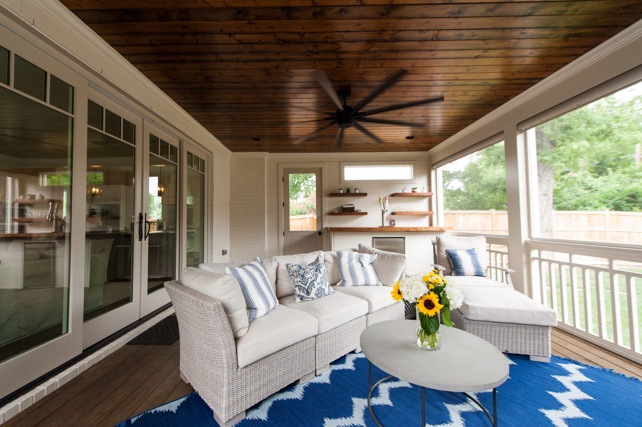 Popular options are a combination of a screened-in porch with an outdoor kitchen, or perhaps a smaller screened-in porch with a patio, fire pit, or a bar — it’s all about the homeowners’ preferences.