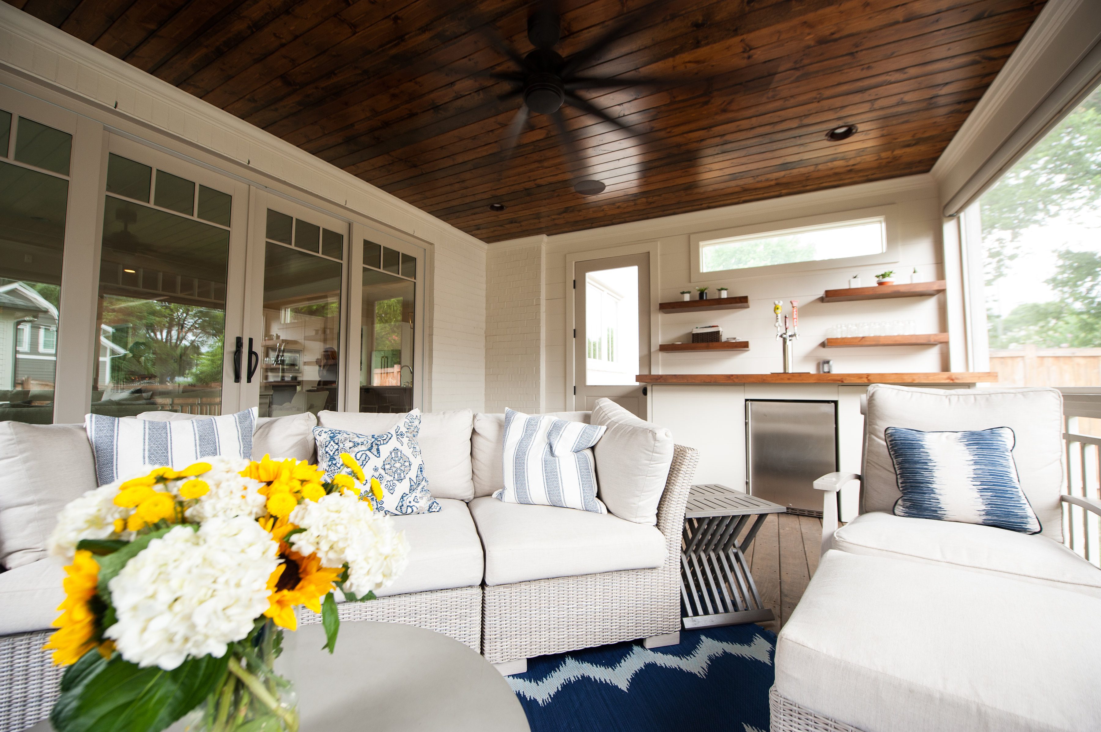 Popular options are a combination of a screened-in porch with an outdoor kitchen, or perhaps a smaller screened-in porch with a patio, fire pit, or a bar — it’s all about the homeowners’ preferences.