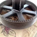 At the center of his booth is a beautiful wooden table framed with an orange iron rim. The base was once a large pulley from some archaic machinery. Tilley begins describing in detail exactly how it originally works, because, well, he knows his stuff. His customers like learning about the original purpose of a gear or other element and ask for this context.