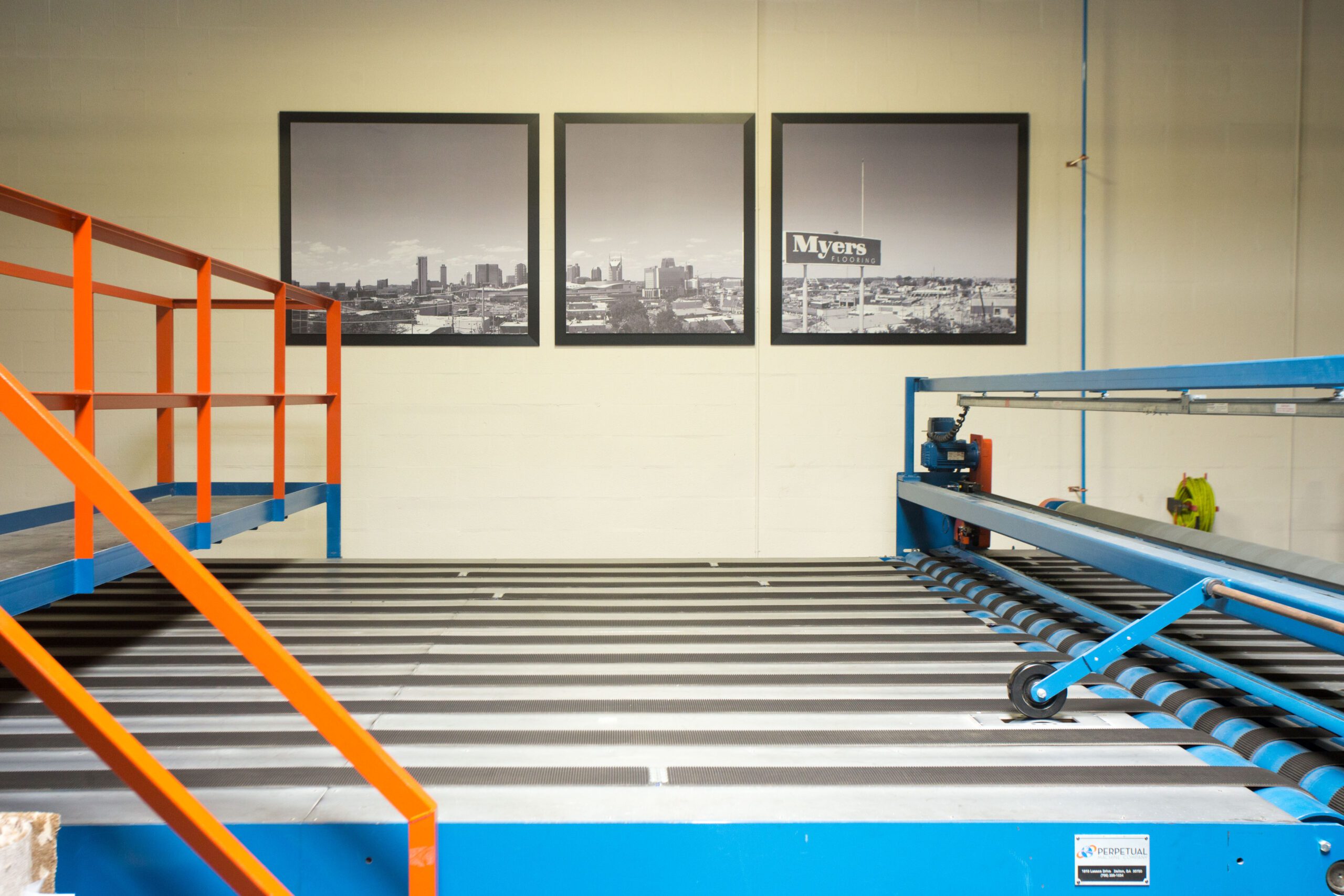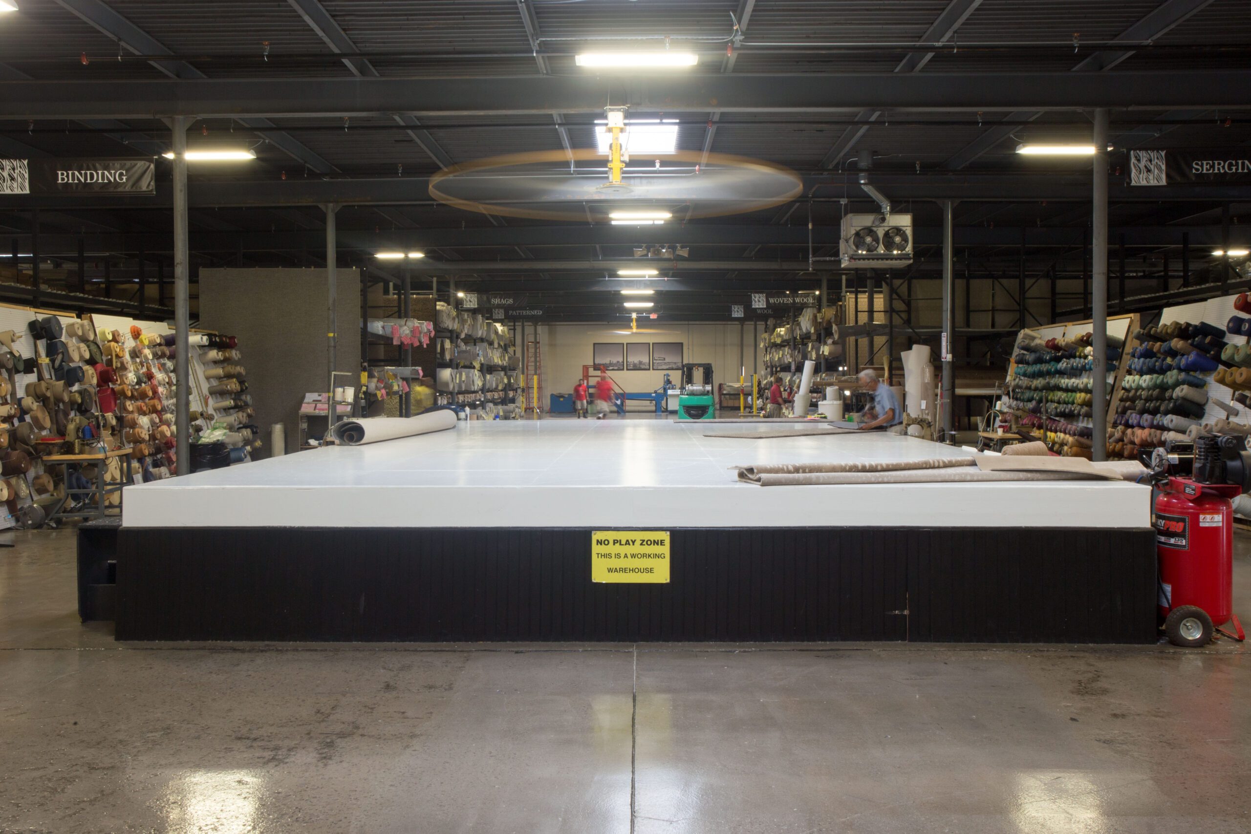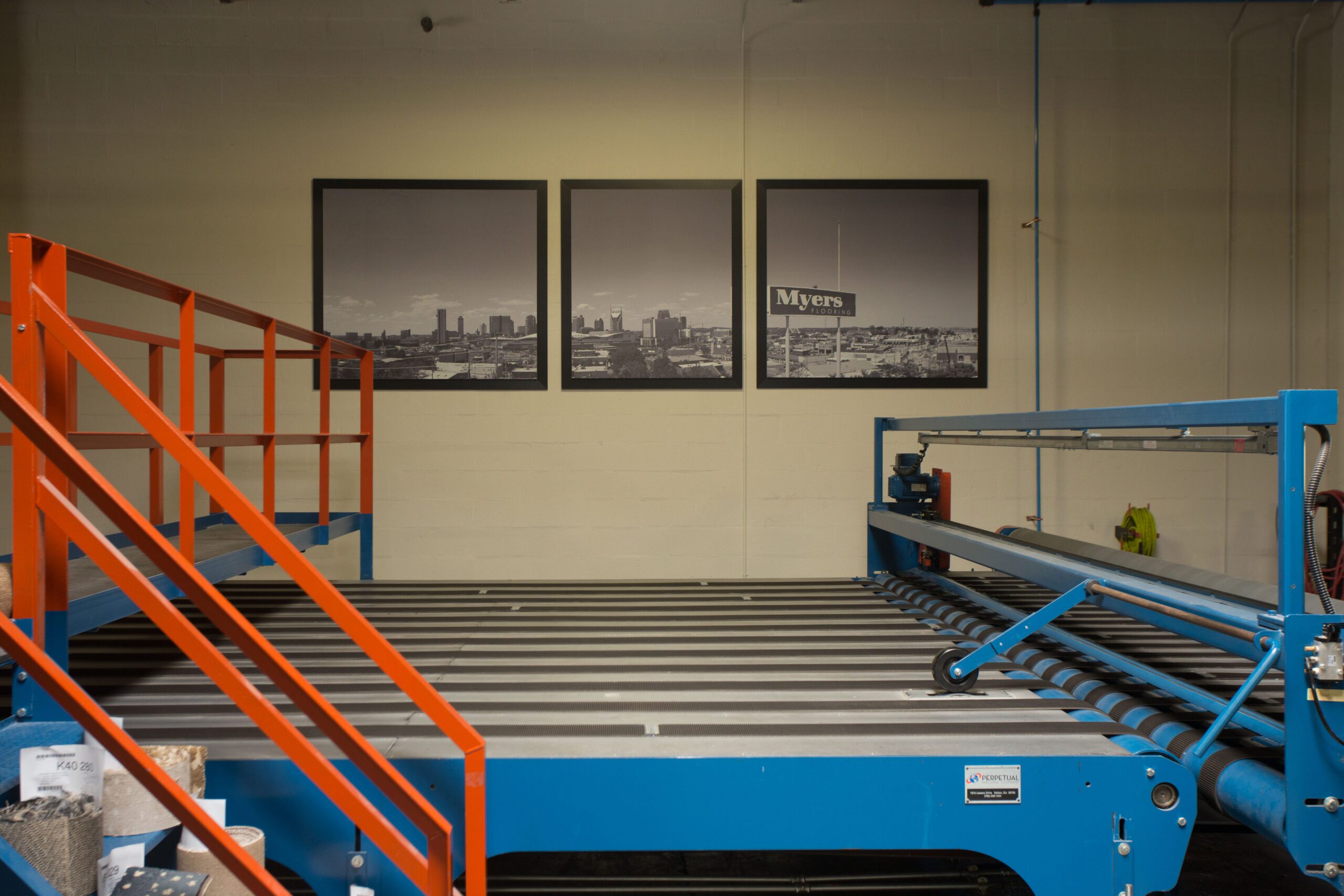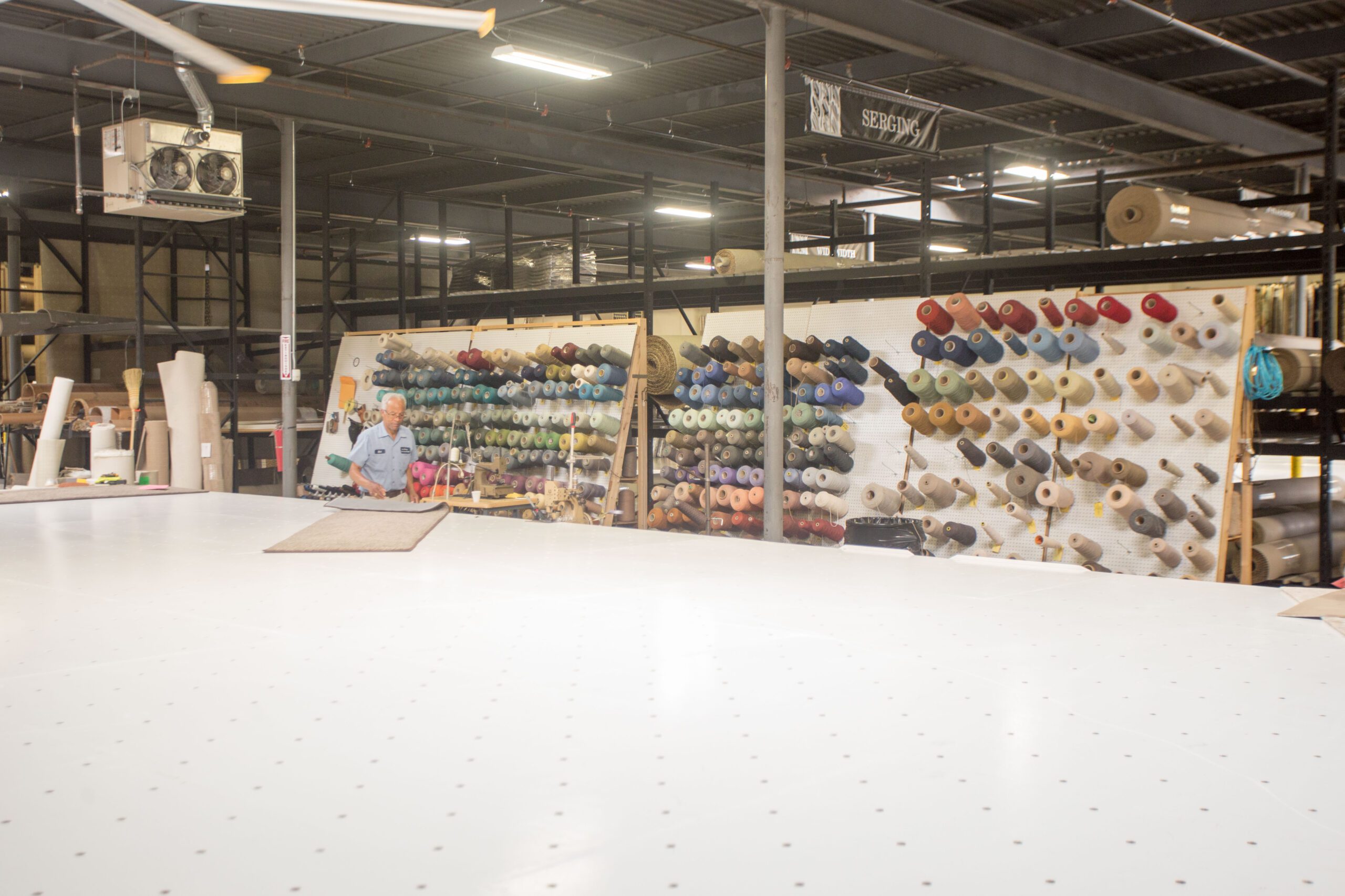 And just like Gene did back in the day, serging runners in his work room, the showpiece at Myers is their work room. Its air table, designed by Ray, is so large you can take any sample in the showroom, any roll of carpet they have, and make hall runners, staircase runners and any size custom rug, right on site.