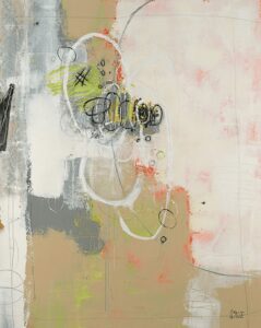 Directly above: Mia Stone, ‘Pendulum Series,’ acrylic on canvas, 48″x60″  (The other artwork is ‘Urbana’ by Elya DeChino’s, 24″x36″)