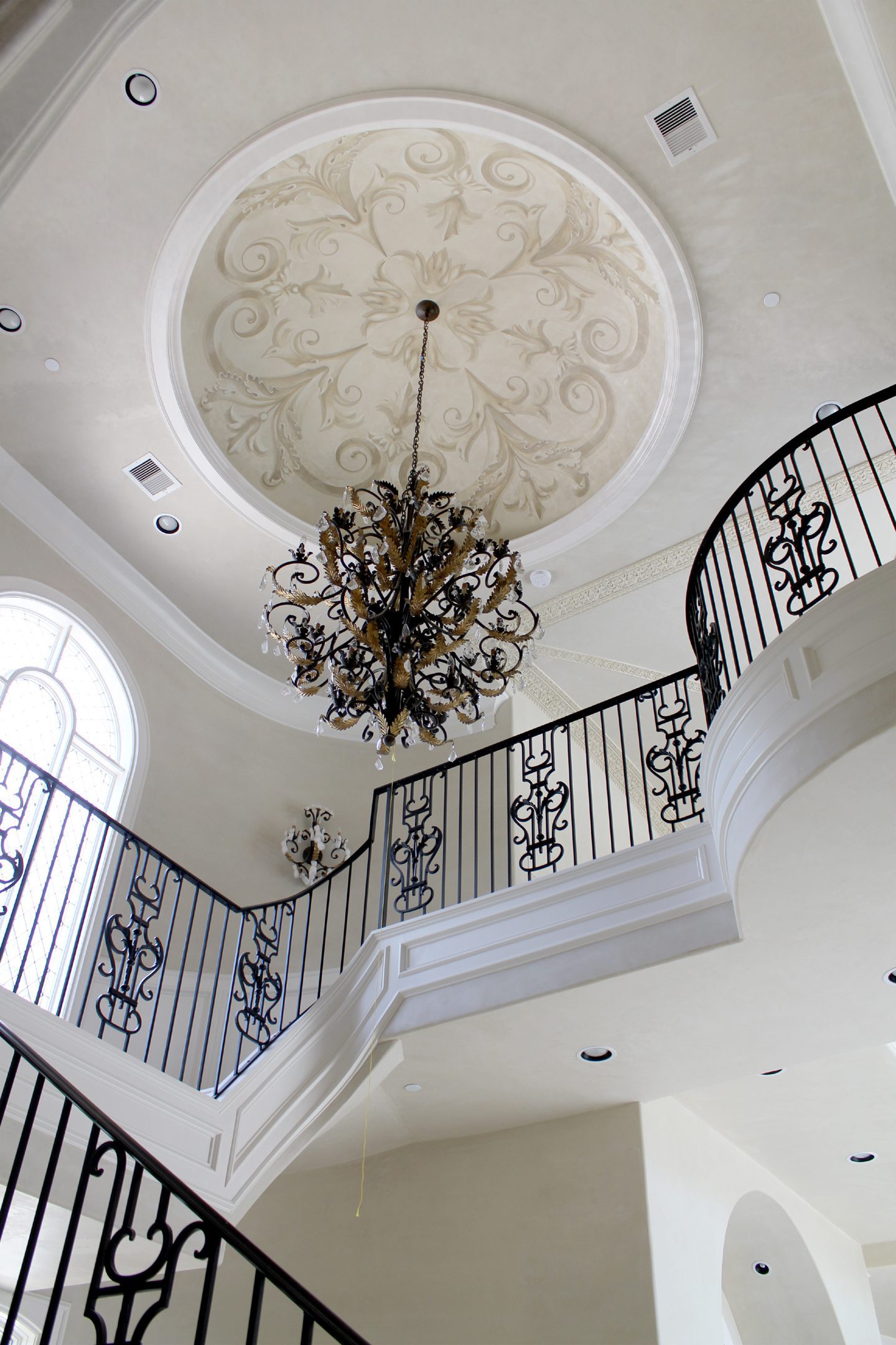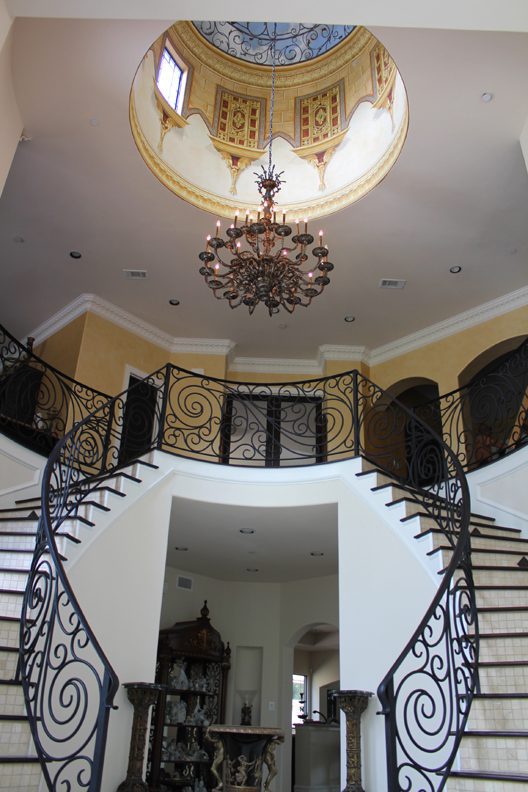 Dome painting with a subtle color and classical motif brings attention to the stunning architecture of this Houston home.