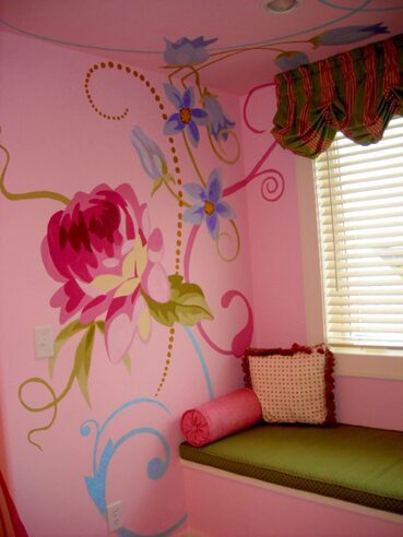 The process of creating a mural is done thoughtfully to avoid being intrusive to her clients. She visits the space for inspiration and measurements, but often completes the fine art painting on large canvas fabric in her art studio. She ships the final work to clients in Houston, Atlanta, or anywhere in the US, and directs professional art installation teams. This process ensures her client has minimum disruption in their home.