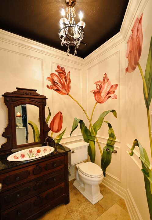 Large scale tulip mural by Ali Kay takes this guest bathroom from charming to stunning.