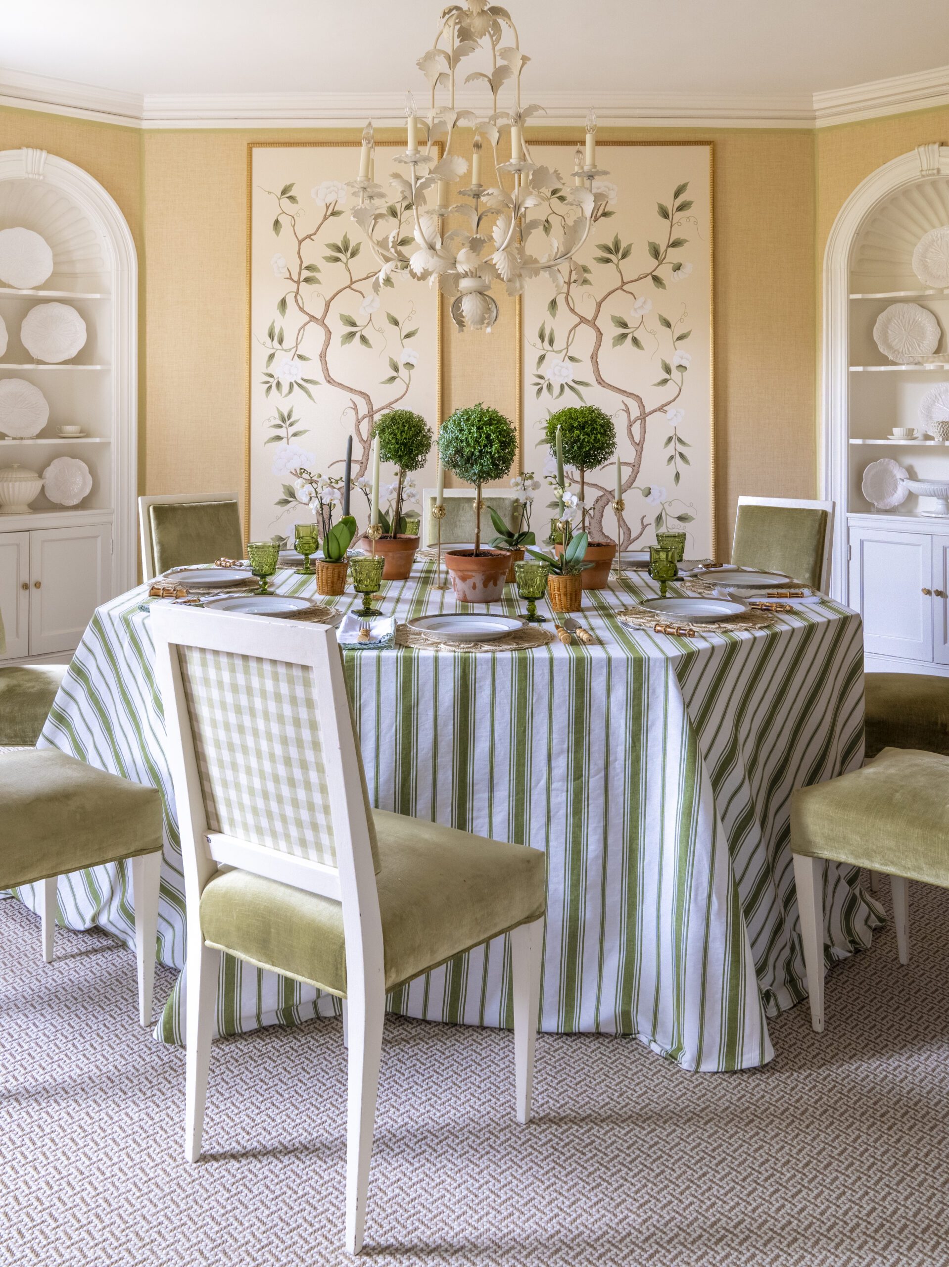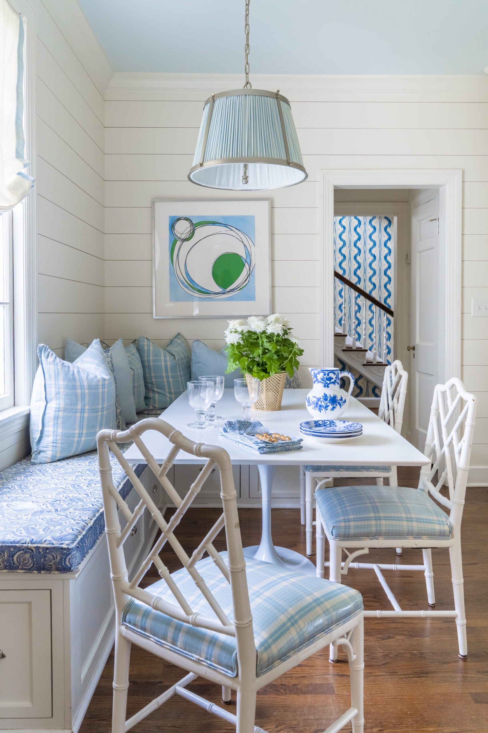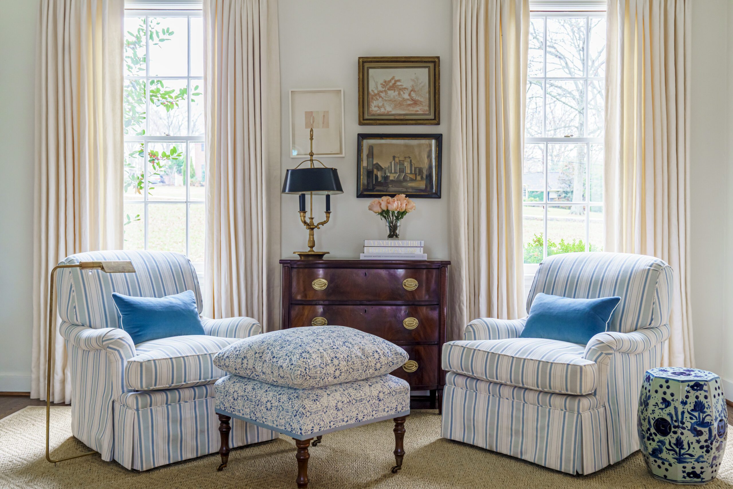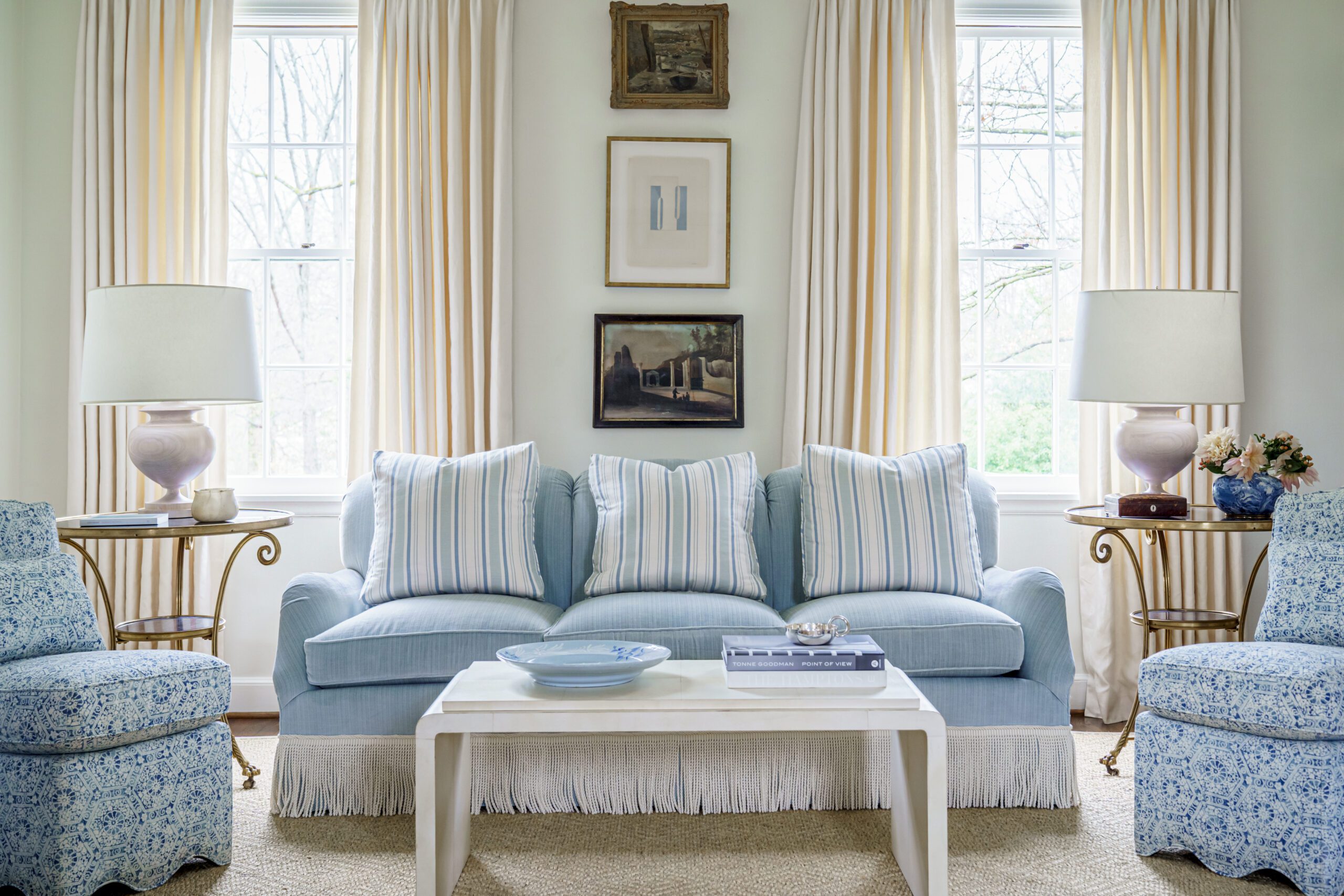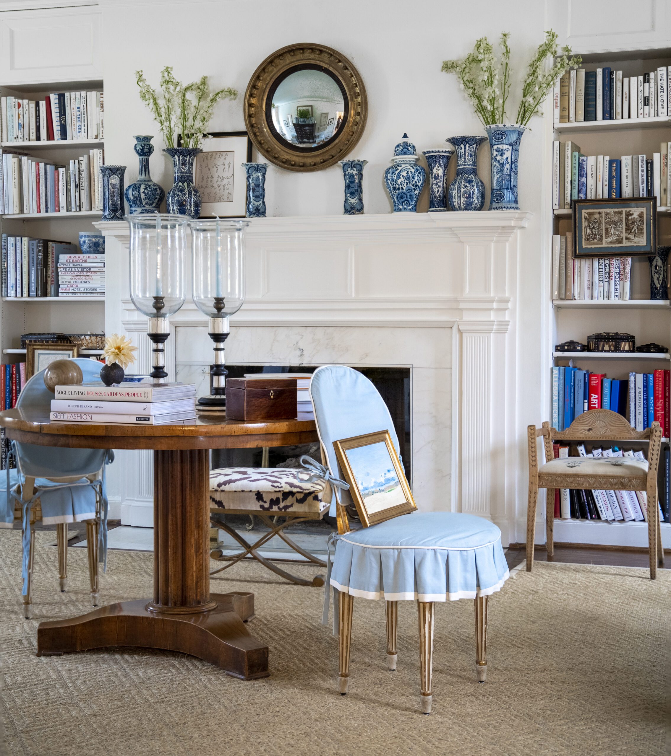 Those collections include blue-and-white porcelain Tori Shelton English quill boxes, art and anything wicker. “So you’ll find baskets everywhere,” she says.