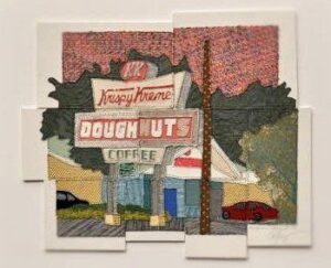 Cary’s upholstery fabric swatches form a collage that leads our eye to the macro skyline of Raleigh and then to the neighborhood view of evening light when cast on a brick wall. We get to see the North Carolina sweetheart, Krispy Kreme, ‘getting up to make the donuts.’ Tabernacle Baptist Church forever gets to stand tall at the intersection of the secular and profane.