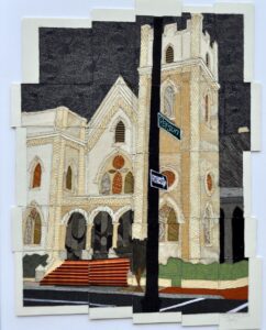 Those interested in her design process can listen to this WUNC recording of Cary discussing the various landmarks she has interpreted in art and their stories. “Collage, made by sewing fabric on to paper, is very much a friend of the quilt,” she says. She works from photographs which she draws on to isolate architectural and natural elements, planning what to emphasize in her composition. Cary then cuts the photograph to create her main patterns. She adds freehand bare needle embroidery with the sewing machine to elevate the ordinary as beautiful and add detail and depth. Listen HERE.