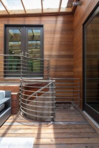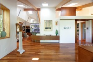 The house features a mixture of blond and red woods, and they chose white as the dominant paint color to embrace the variation in natural materials.