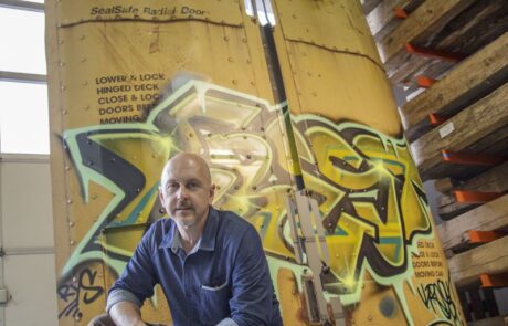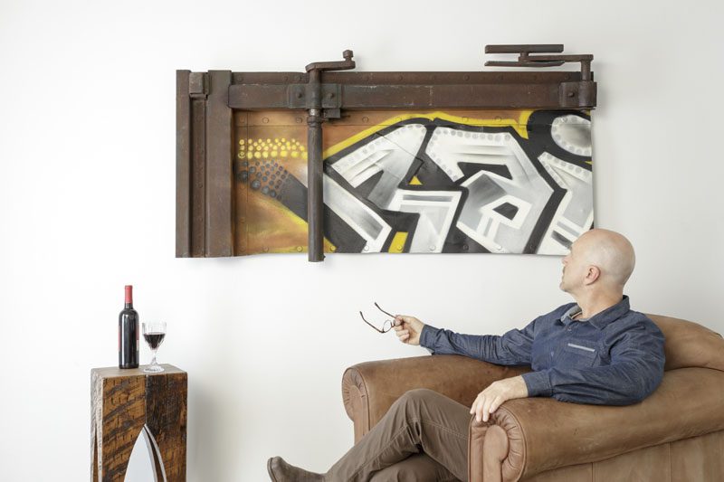 “I source materials and create ‘steel canvases’ retaining interesting lettering and artifacts while creating a space for Troy to fill. Troy adds his touch, pulling in colors to complement the tones of the raw canvas — the rust, fading paint and decals of the cars.”