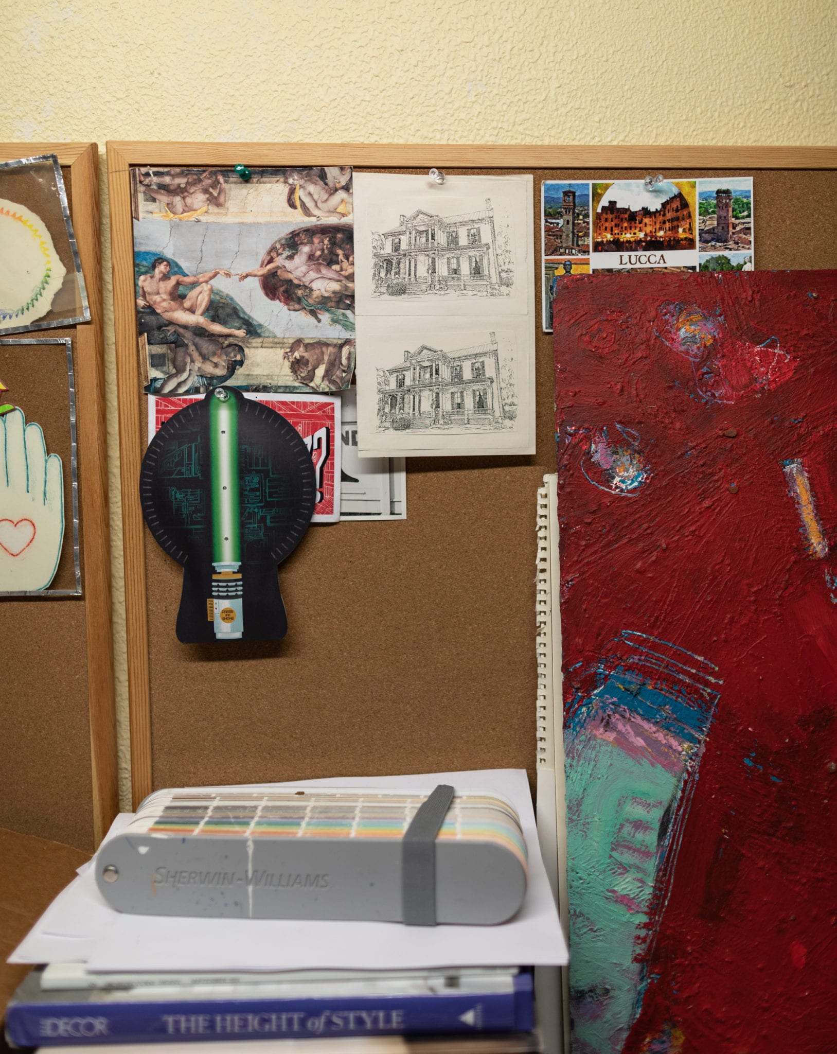 “Everything I do is either hand-painted or something is handmade and applied,” he says, including panels created using an old mural technique of painting on massive sheets of canvas that are then applied like wallpaper.