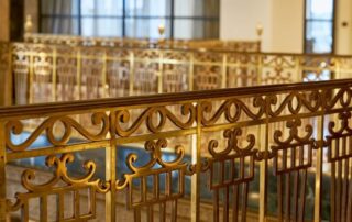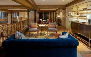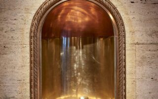 Original terrazzo flooring and marble walls have been restored, along with the original elevators, mail drop and water fountain, while enhancing custom pieces were created, like the library table with integral lighting by Holler Design, bar with walnut millwork by Tate Ornamental, brass LED chandeliers by Michael Anastassiades, custom brass tables by KG Custom Creations and wall sconces by Apparatus on original marble columns.