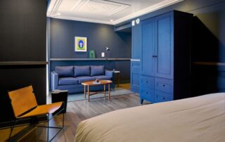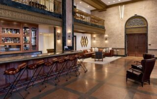 Vintage furniture was restored and reupholstered by Willow Branch Upholstery, and the original windows have been brought back to life. And new continues to meet old in the guest suites, with hickory hardwood floors throughout, custom ceiling detail and millwork designed by DAAD and built by Hartert Russell, and custom leather chairs by Emil Erwin. On the 12th floor, there are four similar but unique penthouse apartments with built-in kitchens and vintage accessories.