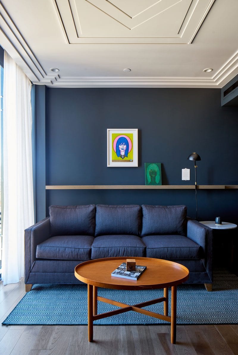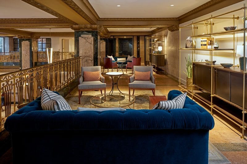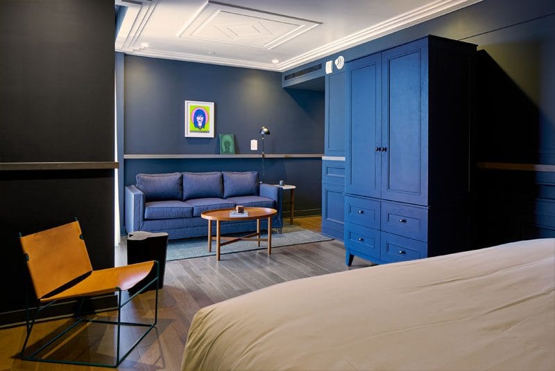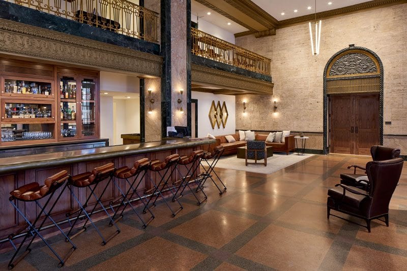 Vintage furniture was restored and reupholstered by Willow Branch Upholstery, and the original windows have been brought back to life. And new continues to meet old in the guest suites, with hickory hardwood floors throughout, custom ceiling detail and millwork designed by DAAD and built by Hartert Russell, and custom leather chairs by Emil Erwin. On the 12th floor, there are four similar but unique penthouse apartments with built-in kitchens and vintage accessories.