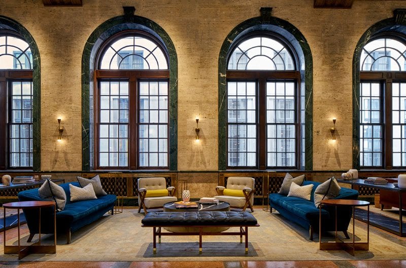 Original terrazzo flooring and marble walls have been restored, along with the original elevators, mail drop and water fountain, while enhancing custom pieces were created, like the library table with integral lighting by Holler Design, bar with walnut millwork by Tate Ornamental, brass LED chandeliers by Michael Anastassiades, custom brass tables by KG Custom Creations and wall sconces by Apparatus on original marble columns.