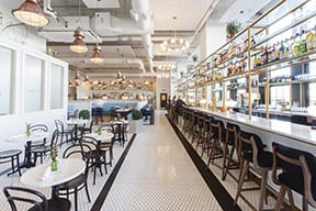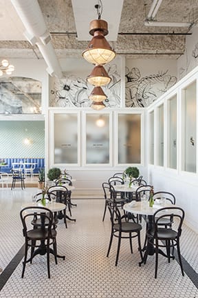 In designing the 6,100-square-foot space of Liberty Common, Raley sought to borrow the essential elements of a traditional brasserie, such as a brass back bar system and marble architectural features, while avoiding a full-scale reproduction of French-American hybrid bistros. The result is a Southern brasserie with bright blue booths and tile but without the reproduction of French architectural elements typical of brasseries in other cities.