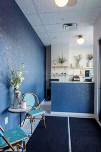 In designing the 6,100-square-foot space of Liberty Common, Raley sought to borrow the essential elements of a traditional brasserie, such as a brass back bar system and marble architectural features, while avoiding a full-scale reproduction of French-American hybrid bistros. The result is a Southern brasserie with bright blue booths and tile but without the reproduction of French architectural elements typical of brasseries in other cities.