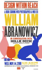 During the inaugural Nashville Design Week, photographer William Abranowicz came to Design Within Reach to speak about his new book, American Originals (Vendome, September, $65), which is a visceral look into the private worlds of some pretty authentic individuals with incredible personal style, including Ellen DeGeneres and Portia de Rossi, John Mellencamp, Robert Couturier, Jeffrey Bilhuber, Bette Midler and Martin von Haselberg, Cliff Fong, Mayer Rus, Linda Rodin, Martha Stewart, and Federico de Vera.